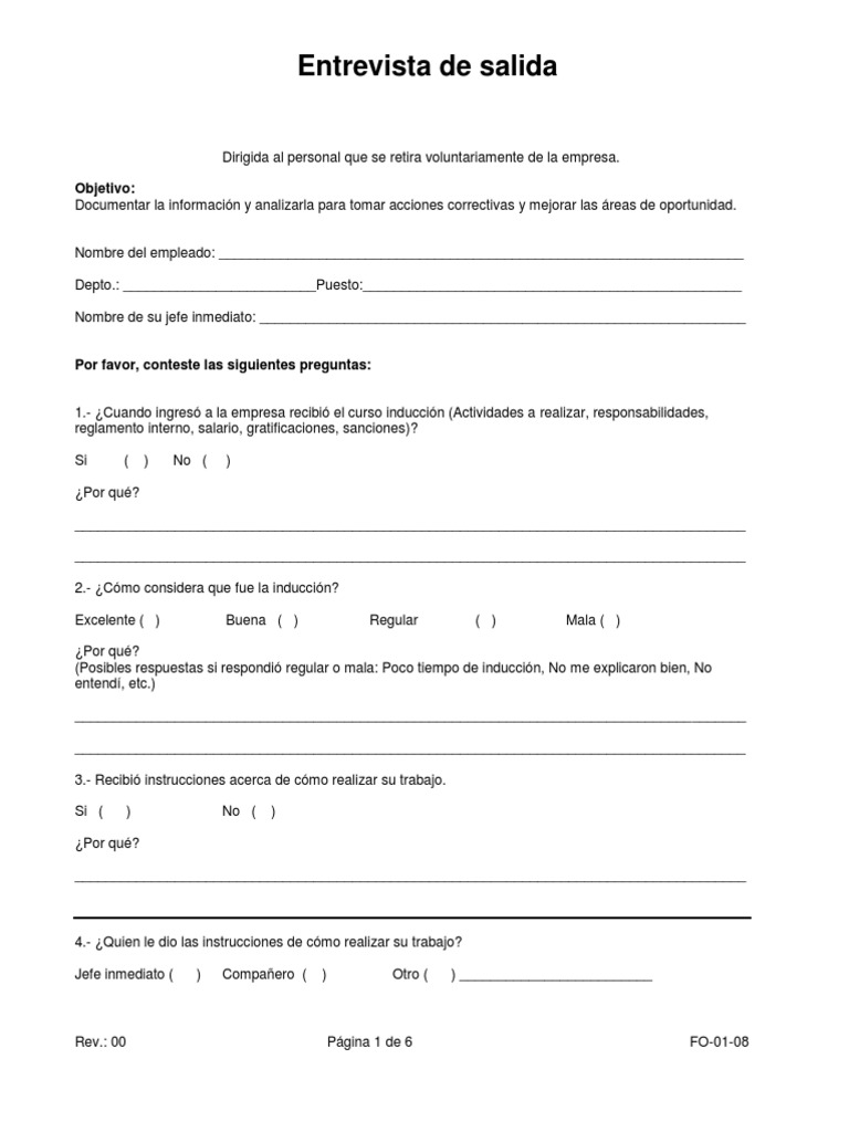 Aprenda sobre sus motivos para encontrar maneras de animar a otros a quedarse. Lo primero que debe hacer el departamento de recursos humanos tras recibir la noticia de la marcha de un empleado es proporcionarle la encuesta de salida laboral y recordarle que pasado un tiempo se agendará una reunión para ampliar la entrevista. Le permite conocer las causas de salida de los empleados para emprender acciones correctivas. Hay encuestas de salida dirigidas por levantadores de campo que filtran a un cierto número de personas y que sirven para observar la tendencia en las elecciones. También contiene una pregunta abierta hacia el final para que los empleados puedan hacer comentarios.